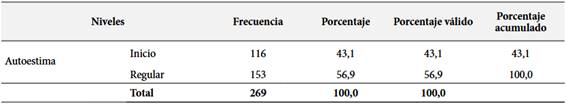 En referencia a la Tabla 4, los resultados se agrupan en dos niveles al analizar el factor autoestima: Inicio 116 estudiantes (43.1 %) y Regular 153 estudiantes (56.9 %). Se observó que el 43,1 % de la población estudiantil señalaron que la autoestima dimensión del aprendizaje invertido se encontró en el nivel “inicio”, lo que sugiere que este grupo considera no tan relevante este factor en el fortalecimiento de su autoestima. En cambio, la mayoría de los participantes en un 56.9 % considera la influencia de la autoestima como promedio, lo que indica que este grupo aprecia que la estrategia de aprendizaje invertido si impacta en ese factor. No hay estudiantes en niveles altos de autoestima, lo que es un dato preocupante, ya que la confianza en uno mismo es clave para el éxito en métodos de aprendizaje que exige un ambiente de aceptación como el aprendizaje invertido.