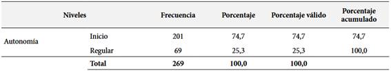 En referencia a la Tabla 5, los resultados se agrupan en dos niveles al analizar el factor autonomía: Inicio: 201 estudiantes (74.7 %) y Regular 69 estudiantes (25.3 %). Se observó que el 74,7 % de la población estudiantil se encuentra en el nivel de inicio, ello sugiere que consideran que la autonomía no es un factor que influya en el rendimiento del aprendizaje invertido. En cambio, solo el 25,3 % el nivel de autonomía lo consideran promedio, lo cual señala que este grupo de estudiantes al trabajar el aula invertida obtienen mejor aprovechamiento de este factor y por ende del aprendizaje. La autonomía es un factor crítico por mejorar en la implementación del aprendizaje invertido. La ausencia de estudiantes en niveles altos de autonomía muestra que los estudiantes aún dependen mucho de la guía del docente y pueden no estar preparados para gestionar su propio aprendizaje.