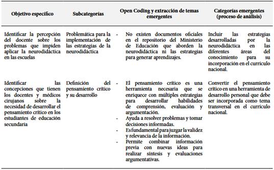 En la Tabla 4, se presenta un proceso de análisis cualitativo que sigue una lógica inductiva, partiendo de datos empíricos para generar categorías conceptuales. El objetivo principal es comprender las concepciones de docentes y médicos cirujanos sobre la neurodidáctica y el pensamiento crítico en la educación secundaria.