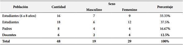 Se desarrolló, la investigación etnográfica educativa en dos instituciones educativas interculturales bilingües y la práctica docente del bilingüismo a través de la oralidad del pueblo kichwa (cuentos andinos). Además, la población fue 48 estudiantes de cuarto y quinto año de Educación Básica de la Unidad Educativa Intercultural Bilingüe San Juan Bosco y el Centro Comunitario Intercultural Bilingüe República del Ecuador de la comunidad rural Quesera. También, docentes y padres de familia con la finalidad de construir una perspectiva amplia del objeto de estudio. Ambas instituciones son similares, por la población de estudiantes indígenas, la variedad lingüística del kichwa y el castellano, donde la tradición oral conservada en el sentipensar familiar y comunitario conforme a su cosmovisión. Tabla 1.
