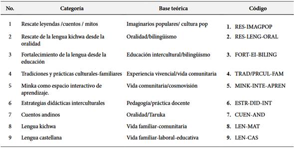 Ahora bien, de la información recolectada se determinaron nueve categorías, códigos con su base teórica (origen), al considerarse su vínculo entre la cosmovisión andina (cuentos, prácticas, tradiciones) y las estrategias didácticas interculturales para desarrollar el bilingüismo del kichwa-castellano en los centros interculturales bilingües, Tabla 2
