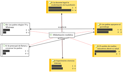 La alfabetización mediática fue la menos desarrollada, se dio crédito a las noticias televisivas y de WhatsApp, a través de llamadas telefónicas a los padres se eligieron la TV y WhatsApp para acceder al programa oficial de estudios y en los hogares priorizan la conectividad a clases en favor de los estudiantes de grados superiores; se realiza el diagnóstico de los dispositivos con los que cuentan las familias, además durante la pandemia se hizo seguimiento a las familias afectadas por el COVID - 19.