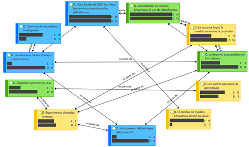 Se inició desde el primer año de confinamiento social, los escolares lograron el uso autónomo de las plataformas; las herramientas virtuales se instituyeron y facilitaron el trabajo colaborativo, salvo para una minoría que carecía de dispositivos inteligentes; en la interacción con los estudiantes se identificaron dificultades familiares y se ofreció soporte emocional a los padres; los alumnos fueron alfabetizados en el empleo de dinámicas interactivas y eran monitoreados durante su uso, se realizaban actividades lúdicas y gamificación para entretenimiento y se establecieron las normas de netiqueta, Figura 2.
