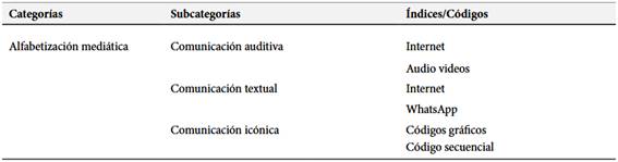 La tabla contiene las categorías de alfabetización, las subcategorías y los códigos, los cuales sintetizan lo que busca la investigación, hay muchos otros fenómenos contextuales que rodean el escenario, sin embargo, los que buscan los investigadores de manera fundamental, son los que aparecen en la tabla 1 y que son los que aportarán los datos e información para la fase analítica.