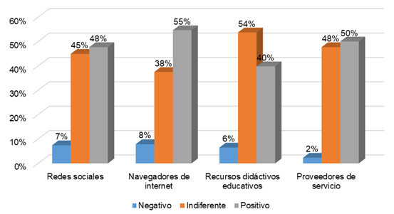 Sobre la identificación de proveedores de servicios en el uso de las TIC en estudiantes de inglés de una Universidad Pública, el 50% de los estudiantes percibe que es de nivel positivo porque para el propósito del aprendizaje del inglés emplean el correo electrónico, la nube y las plataformas; todas ellas contribuyen al propósito pedagógico. Sin embargo, en los resultados propuestos por Chauhan (2022) indicó que este medio es empleado en las universidades en Estados Unidos para comunicarse y transferir información entre estudiantes y enviarse mensajes sobre los avances de sus trabajos, pero para la comunicación entre estudiante y docente considera que es un medio informal de comunicación, y los propios docentes lo consideran inapropiado, es por ello que rechazan este tipo de comunicación. Asimismo, este último resultado es reforzado por Munalia et al. (2022) donde el 46% de los estudiantes de una universidad en Indonesia, respondieron que el uso de medios electrónicos como el WhatsApp no es estratégico para aprender inglés, especialmente para discutir y responder preguntas; sin embargo, el 73% estuvo de acuerdo en que el uso de WhatsApp es estratégico especialmente para entregar la tarea, porque es un medio más sencillo y rápido para ese propósito.