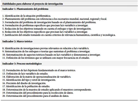 Tabla 1. Habilidades para elaborar el proyecto de investigación