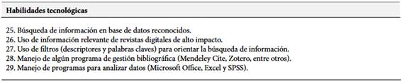 3) Habilidades tecnológicas, se refiere a las condiciones adquiridas por el estudiante para utilizar los recursos tecnológicos con el fin de buscar información en base de datos, programas de gestión bibliográfica y análisis de datos estadísticos. Álvarez-Ochoa et al., (2022) mencionan que esta habilidad está basada sobre todo en el uso dominio tecnológico para fines investigativos como búsqueda de información científica en bases de datos, repositorios, y buscadores académicos.
