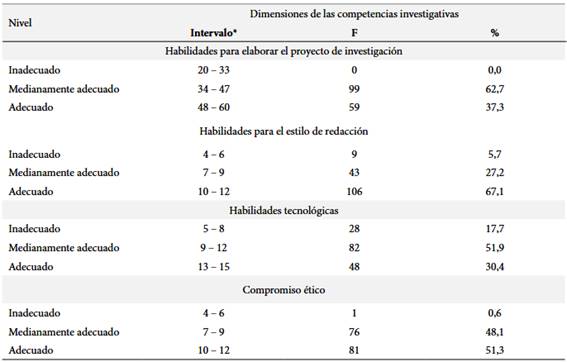 Los resultados obtenidos en las dimensiones del estudio expresan que, en cuanto a las habilidades para elaborar el proyecto de investigación y habilidades tecnológicas se ubican en nivel medianamente adecuado (62,7% y 51,9% respectivamente) y en habilidades para el estilo de redacción y compromiso ético en nivel adecuado (67,1% y 51,3% respectivamente). Se podrías deducir que la mayoría de estudiantes universitarios demuestran habilidades para el estilo de redacción respetando las normas éticas de investigación. Asimismo, un grupo considerable manejan habilidades para la elaboración del proyecto de investigación haciendo uso de herramientas tecnológicas.