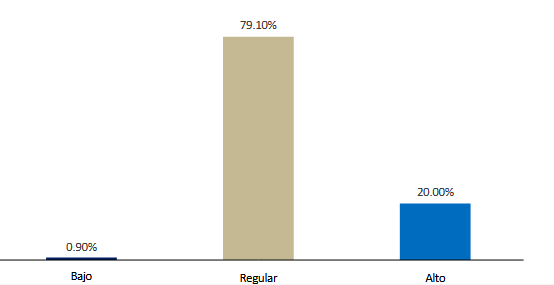 En cuanto al aprendizaje, el 69% de los estudiantes muestra un nivel regular, lo que indica que la mayoría puede adquirir y aplicar nuevos conocimientos de manera efectiva. No obstante, un 28% se encuentra en un nivel alto de aprendizaje y solo un 3% muestra un bajo nivel en esta área; lo cual evidencia un margen de mejora para asegurar que todos los estudiantes desarrollen plenamente su potencial.