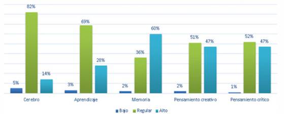 La Figura 2, muestra la distribución de frecuencias de las dimensiones de la neuroeducación de los estudiantes evaluados. En primer lugar, se observa que el 82% de los estudiantes presenta un nivel regular en la funcionabilidad del cerebro, lo que refleja una capacidad adecuada para procesar información, razonar, recordar y relacionar conocimientos. Sin embargo, solo un 14% alcanza un nivel alto en esta dimensión, mientras un 5%, se sitúa en un nivel bajo, lo que sugiere la necesidad de fortalecer estrategias que estimulen el funcionamiento cerebral óptimo en el contexto educativo.