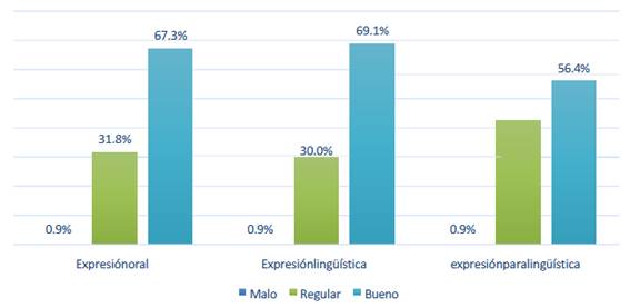 En cuanto a la variable expresión oral y sus dimensiones, la Figura 3 evidencia que un notable 67.3% de los estudiantes se ubicó en el nivel bueno, seguido por un 31.8% alcanzó un nivel regular y solo un 0.9% se clasificó en malo. Este resultado indica que la mayoría de los estudiantes no solamente poseen un manejo adecuado del idioma, sino también un conocimiento apropiado de su vocabulario, así como de la entonación y el tono necesarios para dirigirse a otras personas.