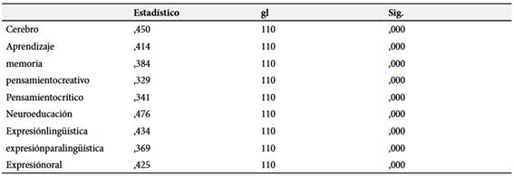 Se aplicó el estadístico K-Sa debido a que la muestra fue de 110 estudiantes, y según los valores de K-Sa (Tabla 1) en todos los casos, el p-valor fue 0.000, lo que está por debajo de 0.05, indicando que hay evidencia estadísticamente significativa para rechazar la hipótesis nula de normalidad. Esto indica que, según esta prueba, ninguna de las variables: neuroeducación y expresión oral y sus dimensiones respectivamente, no se distribuyen normalmente en la muestra dada.