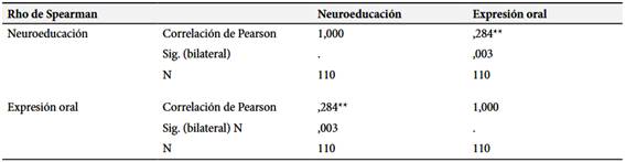 Tabla 2. Relación de la neuroeducación con la expresión oral según Rho de Spearman