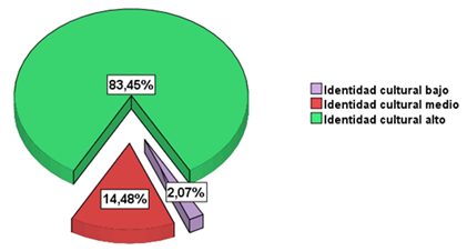 De conformidad a la Figura 1, se observó que 121 estudiantes, equivalentes al 83.45%, exhibieron una alta identidad cultural. Este hallazgo refleja un pronunciado sentido de pertenencia a sus respectivos grupos étnicos, caracterizado por un profundo orgullo en sus valores culturales. Dichos estudiantes demostraron un compromiso significativo con su cultura, lo cual se evidenció en su participación activa en las costumbres, tradiciones y creencias propias de su comunidad. De acuerdo con el instrumento empleado, la lengua originaria fue el elemento más sobresaliente asociado a la identidad.