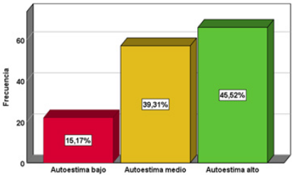 De otra parte, el 15.2% se ubican en el nivel de autoestima baja, estos estudiantes se sienten inútiles, carecen de orgullo y otras veces sienten ser fracasados. Esta actitud negativa, es una disposición de condena en la vida. Una característica es ser desorganizado entre lo que piensan y cómo se proyectan en la vida (Salmivalli et al., 1999). Muestran conformismo personal, repercutiendo en la vida, como; bajo rendimiento académico, depresivos y conflictivos. Pades-Jiménez et al. (2019) estas personas evidencian miedo de diferentes situaciones que impide su realización. Por ello, se debe propulsar una autosuperación que conduzca una vida plena, feliz y con todos los logros materiales y espirituales (Lores et al., 2018). Sin permitir fracasos y dificultades (Branden, 1989; Evert y Álvarez, 2020) para lograr una autoestima acorde a las características físicas, cognitivas y culturales.