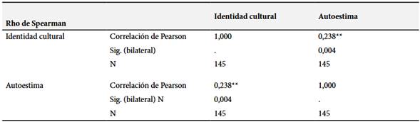 Tabla 1.Correlación bivariada de las variables identidad cultural y autoestima