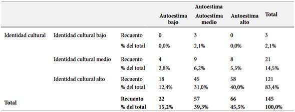 Tabla 2.Tabla cruzada del nivel de identidad cultural y autoestima
