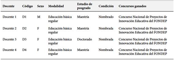 Para la recolección de la información se eligieron a 4 especialistas de educación de Perú para ser entrevistados. Los criterios de selección obedecieron a la modalidad en la que se desenvuelven que es la educación básica regular, así como a la trayectoria en innovación que cada docente presentaba, sus estudios de posgrado y su condición de nombrados en la Carrera Pública Magisterial. Además, cabe resaltar que cada uno de ellos ha resultado ganador de concursos de innovación educativa.