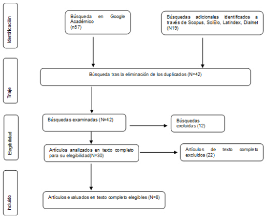 En la búsqueda de fuentes de investigación documental se encontraron 76 registros, durante el proceso de selección se eliminó 34 que no cumplían con los criterios de inclusión referente al tema, posteriormente se revisaron 42 artículos de los cuales se descartaron 12, dando un total de 30 trabajos elegibles, de este total se escogieron 8 artículos los cuales contaban con los criterios para la elaboración del presente artículo de revisión sistemática. En la figura 1 se muestra el procedimiento para la selección de los artículos para este artículo.