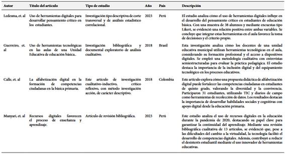 A continuación, en la Tabla 1 se presenta el análisis de los 8 estudios seleccionados, donde se exponen los hallazgos más relevantes en torno al uso, implementación y efectos de los recursos tecnológicos en contextos educativos de nivel básico, permitiendo identificar tendencias comunes, desafíos y oportunidades en la región. Los estudios analizados provienen de distintos países latinoamericanos, lo que proporciona una visión amplia y comparativa del fenómeno.