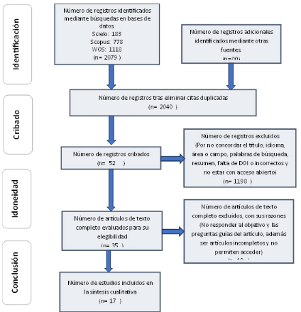 Realizada las búsquedas, en un primer momento de identificación, se registró 183 en Scielo, en Scopus 778 y en WoS 1118, totalizando 2079 artículos, todos correspondiente a los años 2020 al 2024, los cuales se consideran que son investigaciones actuales de los cuales se precisó en trabajar conforme a los aspectos referidos en el flujograma PRISMA. No se buscó otras fuentes. Utilizando criterios de inclusión y exclusión en el cribado se eliminó 39 artículos por duplicidad que aparecían en una de las tres bases de datos utilizadas, quedando con 2040, luego de considerar como criterio de exclusión la concordancia en el título, idioma, área o campo, palabras de búsqueda, contenido del resumen, ausencia de DOI y acceso abierto a los artículos, se excluyó 1198 artículos, quedando como registros cribados 52.