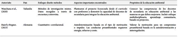 En la Tabla 1 se presenta un resumen de los principales hallazgos de los estudios incluidos en esta revisión. Se observa que la mayoría de los estudios reportan la importancia de la educación ambiental y sus propósitos para el trabajo desde la educación básica.