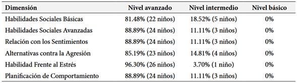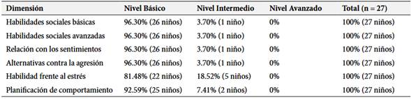 Los resultados obtenidos en el pretest reflejan un nivel muy limitado en las habilidades sociales de los niños evaluados, especialmente en las dimensiones más complejas como la relación con los sentimientos y las habilidades avanzadas. En la mayoría de las dimensiones, los niños se encontraban en un nivel básico, con solo unos pocos casos aislados que mostraron habilidades intermedias. Esto sugiere que los niños no poseían las herramientas necesarias para interactuar socialmente de manera efectiva, lo que podría haber afectado su bienestar emocional y su capacidad para manejar situaciones sociales.