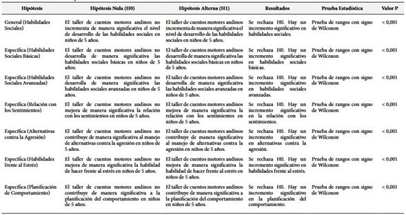 Los valores de p en todas las pruebas fueron menores a 0.001, lo que llevó a rechazar la hipótesis nula en cada caso y a aceptar la hipótesis alterna. Esto demuestra que el taller de cuentos motores andinos contribuye significativamente al desarrollo de las habilidades sociales en diversas áreas, evidenciando una mejora notable en el comportamiento y las habilidades emocionales de los niños.