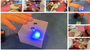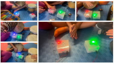 Durante las actividades, los participantes realizaron movimientos corporales al compás de la música, interactuando con el cubo de luz, el cual respondía con cambios de color y estímulos visuales adaptativos. La luz LED del cubo se adaptaba mediante el sensor ultrasónico, permitiendo una interacción activa y personalizada, tanto de forma individual como grupal. Se incorporaron instrumentos musicales tradicionales como bongós, xilófono cromático y shekere para enriquecer la experiencia multisensorial.