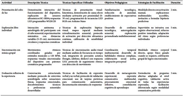 Los cubos tecnológicos reaccionan de manera sensible a estímulos sonoros complejos, movimientos corporales diversos y cambios en la proximidad física, fomentando efectivamente la interacción activa, la exploración sensorial y el aprendizaje colaborativo. La actividad se desarrolla en un ambiente colaborativo y de apoyo mutuo, donde todos los participantes se organizan cómodamente en círculo sobre tapetes de goma especializados, promoviendo de manera intencional la experimentación sensorial personal y grupal, el aprendizaje lúdico y significativo, y el desarrollo de habilidades sociales y emocionales complejas. A continuación, en la Tabla 1, la estructura detallada de las actividades del Mini Taller: