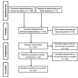 La sistematización y registro de los estudios se realizó conforme a los estándares establecidos por la guía PRISMA (Preferred Reporting Items for Systematic Reviews and Meta-Analyses) en su versión más reciente. Este marco metodológico organizó el proceso en cuatro fases: identificación de estudios, cribado preliminar, evaluación de elegibilidad e inclusión final. Como se ilustra en la Figura 1, que presenta el diagrama de flujo completo del proceso de revisión, el análisis partió de un corpus inicial de 156 estudios y culminó con la selección de 25 investigaciones que cumplieron todos los criterios de inclusión.