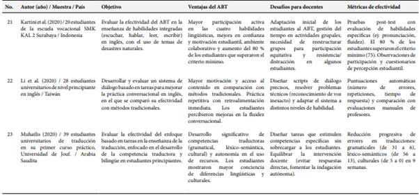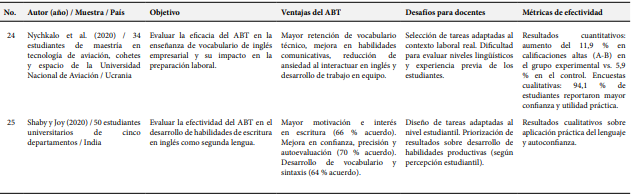 La revisión sistemática de los 25 estudios seleccionados examinó los resultados sobre la aplicación del ABT en la enseñanza del inglés a nivel universitario, con especial énfasis en sus beneficios, retos de implementación y criterios de evaluación. La Tabla 1 presenta un resumen de cada investigación, con datos significativos como autores, año de publicación, características de la muestra, contexto geográfico, objetivos, ventajas del enfoque ABT, obstáculos para los docentes y parámetros de medición de resultados. Esta síntesis de los datos facilitó la detección de tendencias relevantes y patrones comunes en la literatura académica sobre el tema.