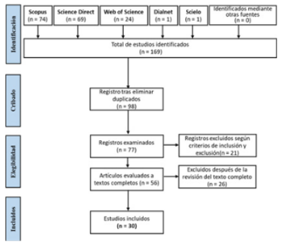 En el proceso de selección de los estudios primero se realizó la búsqueda en bases de datos académicas, luego se eliminaron los duplicados, seguido se realizó el screening inicial basado en el análisis de títulos y resúmenes, posterior a ello se evaluaron los textos completos para verificar el cumplimiento de criterios, y por último se llevó a cabo la selección final de estudios elegibles. La investigación se alineó con los estándares PRISMA (Preferred Reporting Items for Systematic Reviews and Meta-Analyses), documentándose el proceso completo en el diagrama de flujo que se muestra en la Figura 1, donde se detalla las etapas de filtrado en la que se identificaron 169 registros al inicio hasta llegar a los 30 estudios que al final cumplieron con todos los requisitos de inclusión.