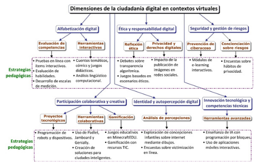 El análisis sistemático de los estudios permitió identificar un conjunto de estrategias que se articulan con las dimensiones de la ciudadanía digital, enfocadas en el desarrollo de habilidades cognitivas, éticas y técnicas. Estas relaciones estratégicas se presentan de manera esquemática en la Figura 2, que sintetiza los principales hallazgos de la investigación.