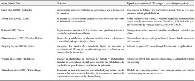 Tabla 1. Síntesis de los estudios que exploraron estrategias para fomentar la ciudadanía digital en estudiantes de primaria a través de plataformas educativas virtuales.