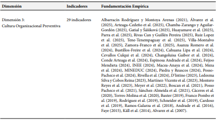 El marco operacional resultante se estructura en tres dimensiones: Competencia Analítica Preventiva, Institucionalización de Procesos y Cultura Organizacional Preventiva, e integra 83 indicadores distribuidos según se detalla en la Tabla 1.