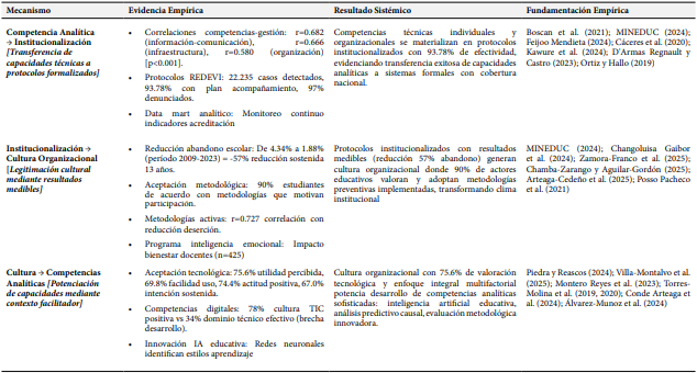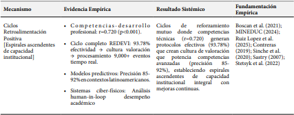 La Tabla 3, presenta los Ciclos de Retroalimentación Positiva: Instituciones con mayores competencias tecnológicas desarrollan mejores protocolos institucionalizados, generando cultura de valoración tecnológica, potenciando desarrollo de competencias técnicas más avanzadas, creando espirales ascendentes de capacidad institucional.