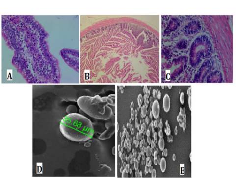 Figura 1. Histología del tratamiento con L. plantarum microencapsulado, según lesiones de intestino de pollos y microfotografía del encapsulado. A) Corte histológico de microvellosidades con implantación de lactobacilos. B) Atrofia severa y fusión de microvellosidades. C) Infiltración linfoplasmositaria en la lámina propia. D) Dimensiones de la microcápsula, y E) Microencapsulado. Microscopio Electrónico de Barrido, Hitachi High-Tech Europe GmbH. Fuente: Jurado-Gómez, et al., (18)