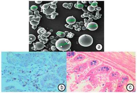 Figura 2. Microfotografía de barrido de L. casei microencapsulado por la técnica de Spray Drying y tinción Alcian blue para caliciformes. a) tamaño del microencapsulado; b) lamina de inmunohistoquímica y c) tinción de Alcian blue para caliciformes. Fuente: Jurado-Gómez y Zambrano-Mora (24)