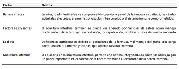 La microbiota intestinal es considerada como una población de agentes muy diversa, en la que se incluyen microorganismos comensales, simbióticos y patógenos que interactúan al interior de individuos pluricelulares complejos (14). La comunidad microbiana del tracto gastrointestinal (TGI) de los pollos de engorde efectúa un papel elemental, ya que tiene una repercusión positiva en el sistema inmunológico, fisiología del TGI y productividad del animal (15). De ahí, la importancia de preservar la salud de esta porción, por lo que es importante conocer los factores que la afectan Tabla 1.