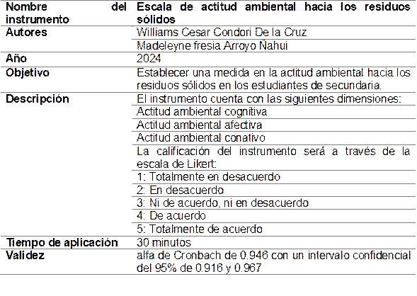 El instrumento empleado para la recolección de datos en el presente estudio es un cuestionario que evalúa las actitudes de las personas hacia el manejo de residuos sólidos. Este cuestionario puede incluir preguntas sobre la percepción de la gravedad del problema de los residuos, las prácticas de reciclaje, la disposición adecuada de los desechos y la responsabilidad individual. Luego, se analizan las respuestas para obtener una medida cuantitativa de la actitud ambiental de los estudiantes del tercer grado de secundaria, Tabla 2.