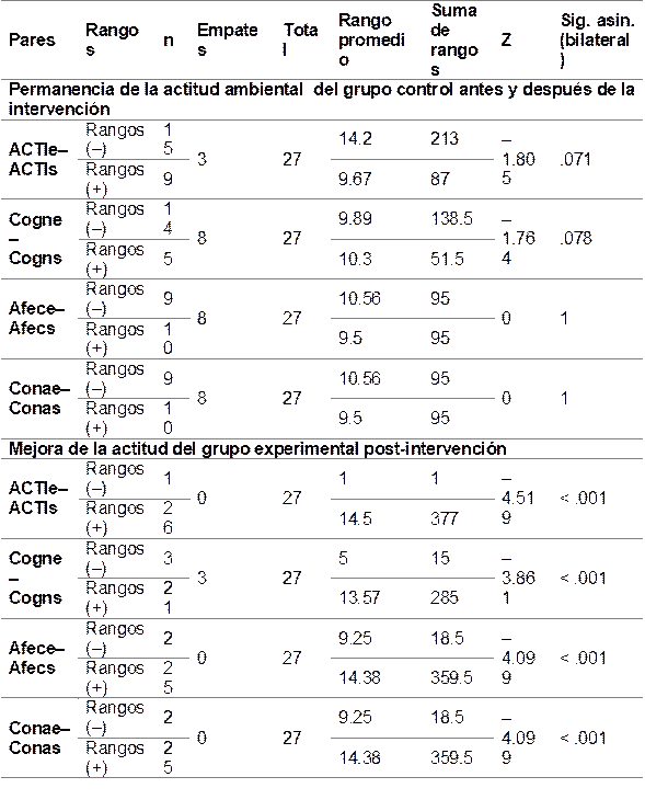La segunda sección de la Tabla 5 se centra en la mejora de la actitud del grupo experimental tras la intervención. Para ACTIe-ACTIs, el grupo experimental mostró solo 1 rango negativo frente a 26 positivos, con un rango promedio de 1 y un Z de -4.519, con una significancia menor a .001. Esto indica una mejora significativa en su actitud ambiental después de aplicar la estrategia de las 3R's. En el componente Cognitivo, el grupo experimental tuvo 3 rangos negativos y 21 positivos, con un rango promedio de 5 y un Z de -3.861 (p < .001), lo que sugiere una mejora notable en su conocimiento sobre residuos sólidos. En el Componente Afectivo, los resultados también fueron positivos, con 2 rangos negativos frente a 25 positivos, un rango promedio de 9.25 y Z = -4.099 (p < .001), evidenciando una mejora significativa en sus emociones hacia el manejo ambiental. Finalmente, para el Componente Conativo, los resultados fueron idénticos al componente afectivo, indicando que los estudiantes del grupo experimental adoptaron comportamientos más proambientales tras la intervención.