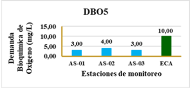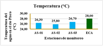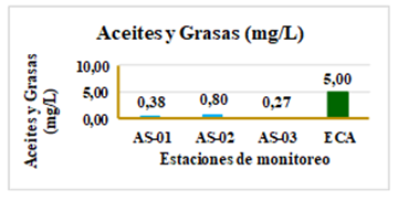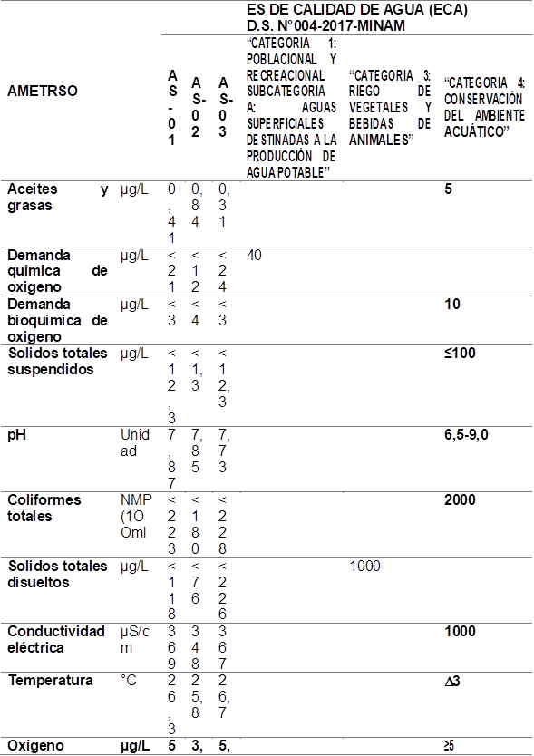 El monitoreo integral en los puntos AS-01, AS-02 y AS-03, con la finalidad de saber sobre el grado de contaminación de las aguas del rio Pisco, revela que varios parámetros clave del agua del río Pisco están dentro de los límites establecidos por los Estándares de Calidad Ambiental (ECA). Los niveles de aceites y grasas, pH, temperatura, y conductividad eléctrica se mantienen en rangos aceptables, mientras que el oxígeno disuelto en uno de los puntos está por debajo del estándar, y luego vuelve a su normalidad indicando un entorno saludable para la vida acuática. Las concentraciones de DBO y DQO están por debajo del umbral permitido, sugiriendo una carga de materia orgánica adecuada. Los sólidos suspendidos y disueltos también se mantienen dentro de los límites. En cuanto a los coliformes totales, los valores están por debajo del límite permitido, lo que indica baja contaminación microbiológica. Estos resultados destacan la importancia del monitoreo continuo para evaluar la calidad del agua y respaldar políticas de gestión ambiental para proteger el ecosistema fluvial del río Pisco (23-25). Lo que proporcionan una base sólida para desarrollar estrategias de mitigación y preservar la integridad ecológica del río frente a las presiones de la contaminación antropogénica.