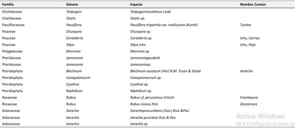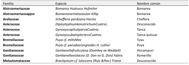 Puyasp. La planta bromeliácea más grande del mundo, que se encuentra en peligro de extinción y es vital para la estructura del hábitat. La existencia en la zona de numerosas especies subraya la singularidad de este bosque y su importancia para la conservación global de la biodiversidad (19). A continuación, se presenta la siguiente tabla la cual contiene más detallas de las especies de flora encontrada en el bosque.