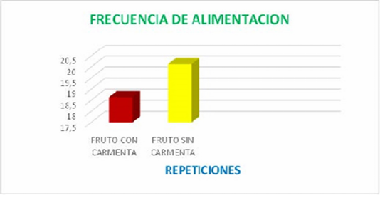 Número de picadas considerado como frecuencia de alimentación. La Carmenta se alimentó durante 12 horas con frecuencia de 2, 5, 4 y 3 picaduras en el pedúnculo de cada fruto, de los 4 frutos de cacao CRIOLLO de 4cm.delongitud.