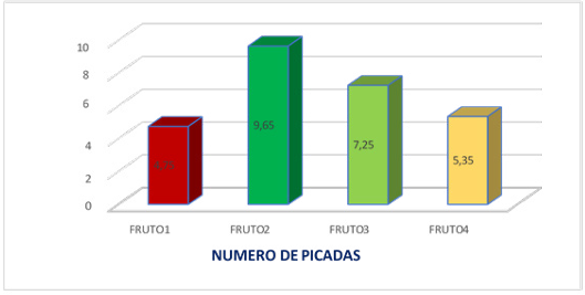 Tabla 1, se evaluaron cuatro unidades de frutos, para evaluar las picaduras a cada uno del fruto considerada como frecuencia de alimentación de Carmenta foraseminis (Busck) Eichlin en frutos de cacao CRIOLLO donde se identificó al Fruto Uno dos picaduras, seguido del Fruto Dos con cinco picaduras, el fruto tres con cuatro picaduras donde el promedio de picaduras por día fueron 3.5 frutos por días 4cm. longitud).