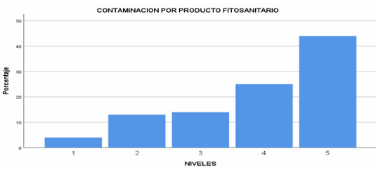 En términos absolutos, 44 agricultores señalaron que la contaminación por productos fitosanitarios alcanzó un nivel extremadamente alto, 25 la consideraron muy alta, 14 la calificaron como alta, 13 la percibieron como moderada y solo 4 la identificaron como baja, como se muestra en la Figura 2.