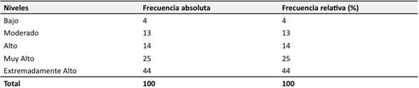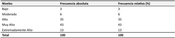 Los resultados sobre el nivel de contaminación por productos fitosanitarios evidenciaron que el 44% de los agricultores percibió un nivel extremadamente alto, mientras que el 25% lo calificó como muy alto y el 14% como alto. En contraste, el 13% de los encuestados indicó que el nivel de contaminación era moderado, y solo el 4% lo consideró bajo, según lo presentado en la Tabla 2.