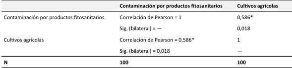 En la Tabla 4, se presentan los resultados del análisis de correlación, en el que se obtuvo un coeficiente de Pearson (R = 0,586*), evidenciando una correlación moderada y significativa entre la contaminación por productos fitosanitarios y los cultivos agrícolas (p = 0,018; p < 0,05). Este hallazgo sugiere que el uso de estos productos tuvo un impacto directo en la calidad de los cultivos, lo que pudo haber afectado su productividad y viabilidad comercial.