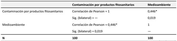 En la Tabla 5, se presentan los resultados del análisis de correlación, en el que se obtuvo un coeficiente de Pearson (R = 0,446*), evidenciando una correlación moderada y significativa entre la contaminación por productos fitosanitarios y el medio ambiente (p = 0,019; p < 0,05). Este resultado sugiere que el uso de estos productos no solo afectó la calidad de los cultivos, sino que también tuvo un impacto ambiental considerable, contribuyendo a la degradación de los ecosistemas agrícolas.
